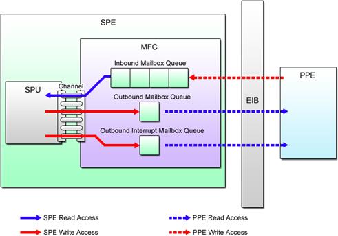 These mailboxes can be accessed either from the SPE or PPE programs. The SPE program uses a channel interface to access the mailboxes. The PPE program does this via mailbox API functions offered by libspe2. Refer to the following documents for more details.