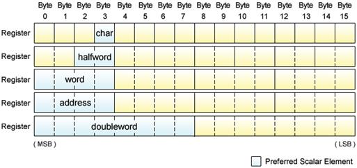 Scalar data does not need to use the entire register; it only uses a predetermined part of the register called the preferred scalar element. According to the scalar data type and size, the position of the preferred scalar element is determined as shown in Fig. 4.11.