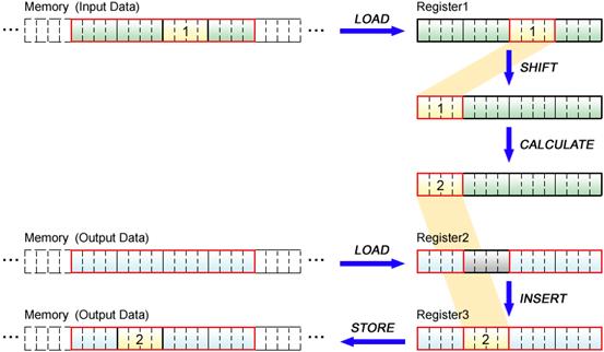Input data, 16 bytes inclusive of scalar data, is loaded to the register and shifted appropriately to the preferred scalar element. When storing the result in the memory, the 16-bytes data inclusive of the location to store is loaded, a part of the 16-bytes data is replaced with the calculated result, and then the whole 16-bytes data is stored, because it is impossible to store just one scalar data.