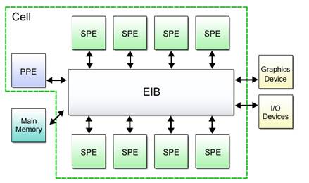The Cell consists of one control-intensive processor core (PPE) and eight compute-intensive processor cores (SPEs). A high-speed bus called the Element Interconnect Bus (EIB) is used for connecting these processor cores within the Cell. The EIB also provides connections to main memory and external I/O devices, making it possible for processor cores to access data.